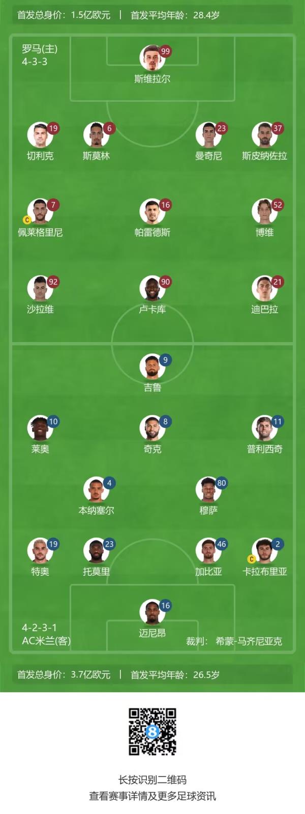 罗马首发:99-斯维拉尔、19-切利克、6-斯莫林、23-曼奇尼、37-斯皮纳佐拉、52-博维、7-佩莱格里尼、16-帕雷德斯、21-迪巴拉、92-沙拉维、90-卢卡库