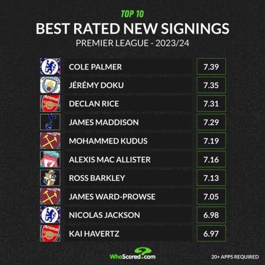 4月20日讯 英超联赛已进入冲刺阶段,whoscored也统计了本赛季新援的评分情况,帕尔默居首。
