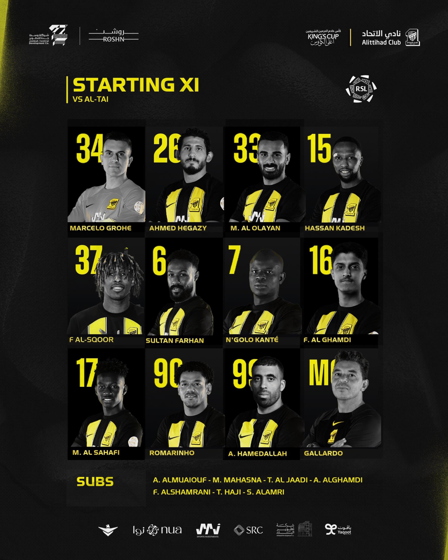 吉达联合首发:34-格罗赫、26-赫加齐、33-奥拉扬、15-卡德什、37-斯库尔、6-法尔汉、7-坎特、16-加姆迪、17-萨哈菲、90-罗马里尼奥、99-哈姆达拉