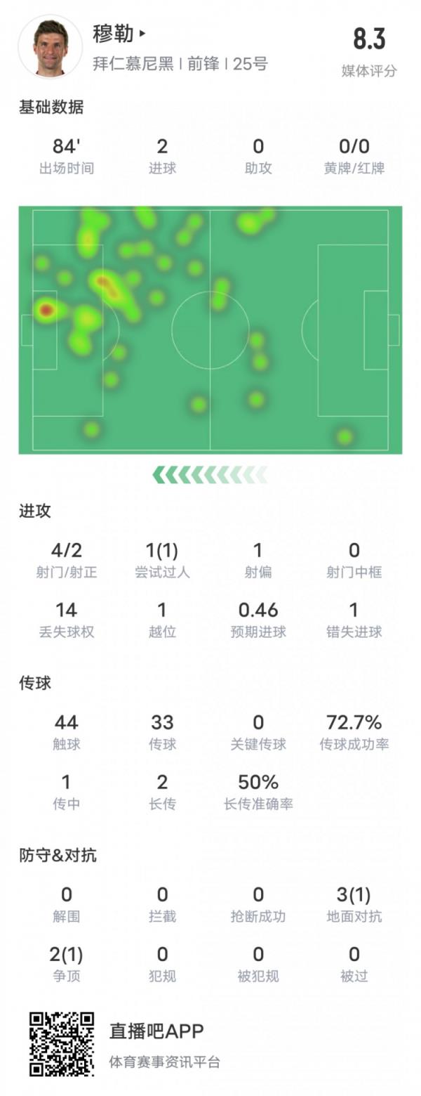 4月21日讯 在对阵柏林联合的比赛中,拜仁攻击手穆勒首发出战,贡献2粒进球,1次过人成功,也有1次错失进球机会,评分8.3。