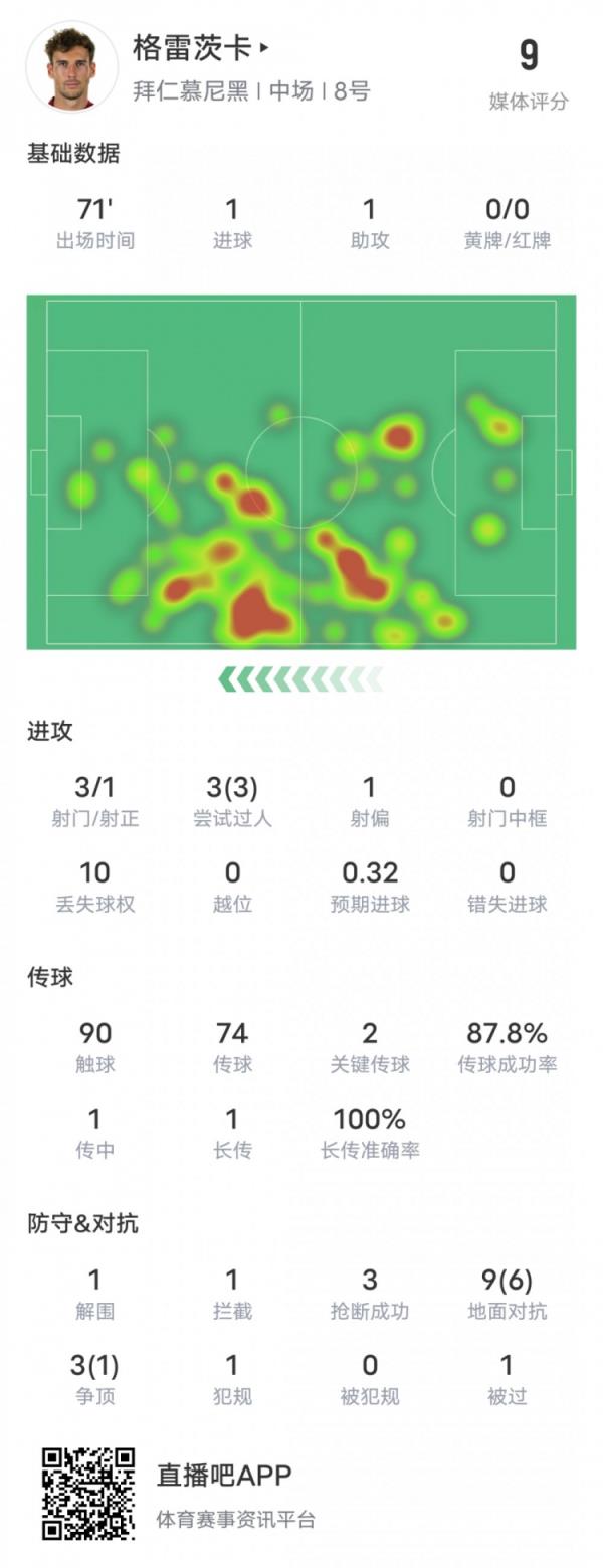 4月21日讯 在对阵柏林联合的比赛中,拜仁中场格雷茨卡首发出战,表现出色,传射建功,3次过人也全部成功,评分9.0。