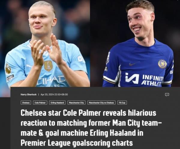 在接受采访时,帕尔默被问到了与哈兰德竞争金超金靴奖的话题,他回答说:“说实话这挺搞笑的,我从未想过这件事。上赛季我和哈兰德还是队友,我们有着共同的目标,而哈兰德在上赛季英超赛场的表现实在是太疯狂了。”