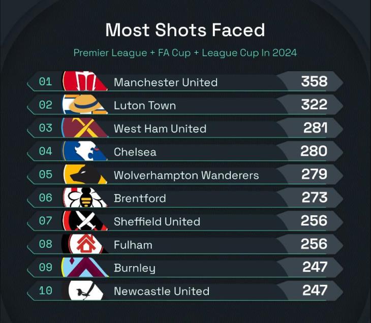 据统计,在今年的英格兰国内赛事中(即英超+足总杯+联赛杯),曼联已经被对手射门了358次,是所有球队中最多的,且比第二的卢顿多了36次。此外,也只有两支球队被射正的次数多于曼联。