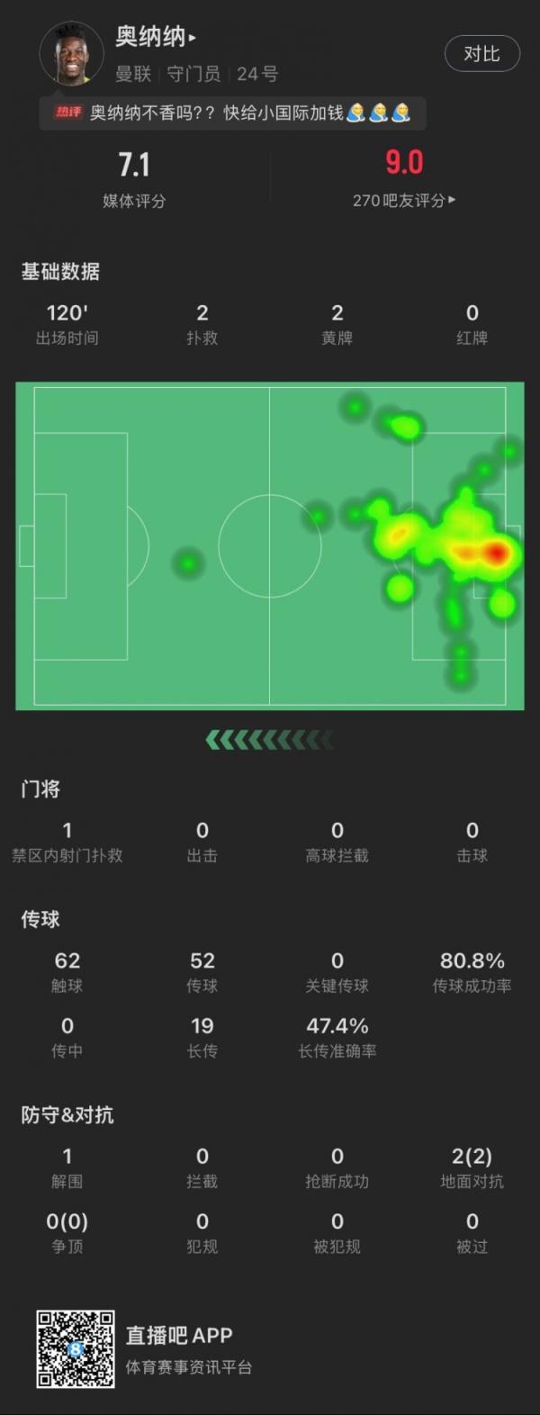 4月22日讯 足总杯半决赛,曼联在点球大战中淘汰英冠球队考文垂,将在决赛中和曼城上演曼市德比。本场比赛,奥纳纳在点球大战中扑点,获评Sofascore7.1分的评分。