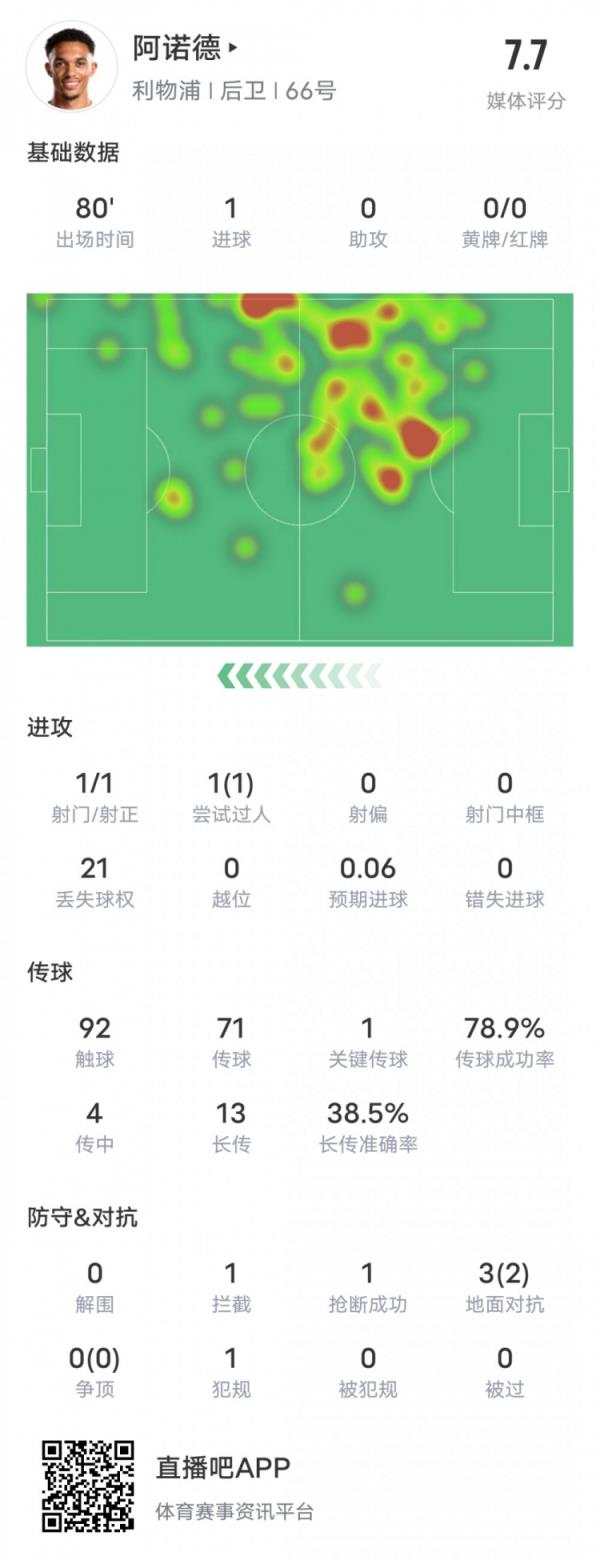 4月22日讯 在对阵富勒姆的比赛中,利物浦后卫阿诺德首发出战,贡献1粒进球,还有1次关键传球,另外他也有21次丢失球权,评分7.7。