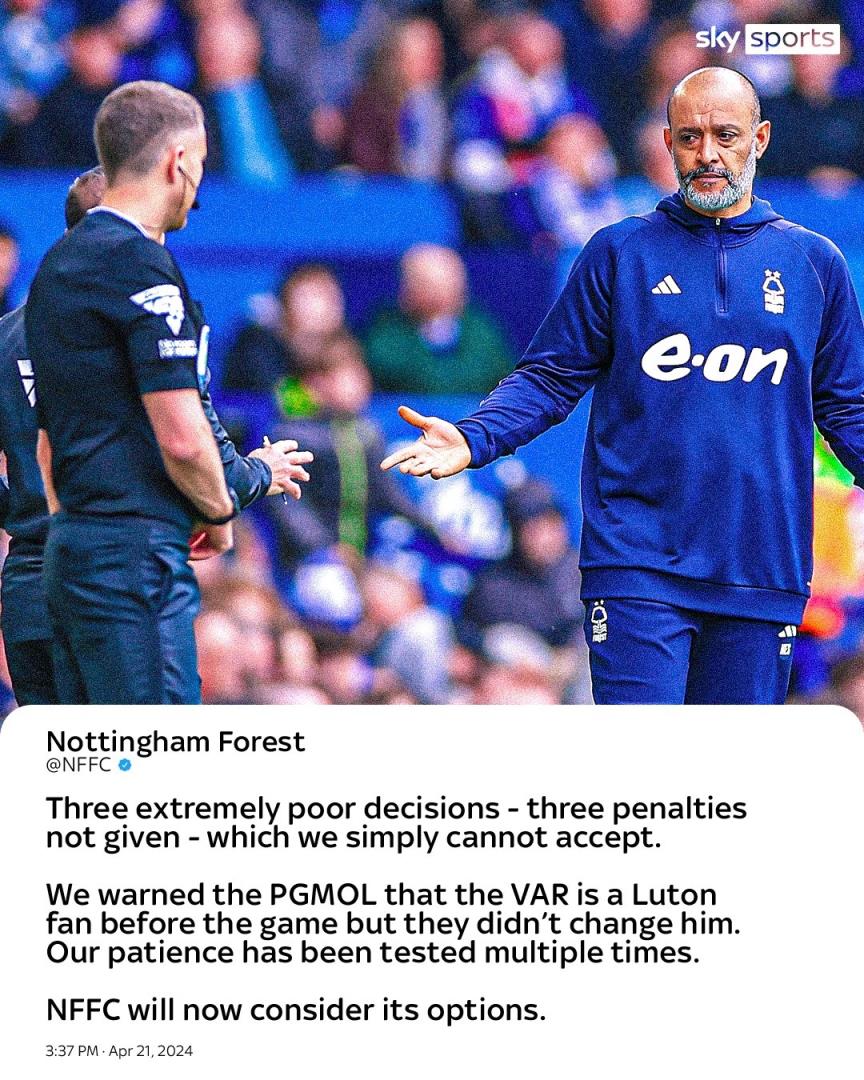 4月22日讯 第34轮英超上演争议之战,诺丁汉森林客场0-2不敌埃弗顿,目前仅领先卢顿1分。比赛中客队的三粒疑似点球都没有得到裁判组的认定,赛后诺丁汉森林官方社媒表达了抗议。一些国外球迷也怒喷了裁判的表现。