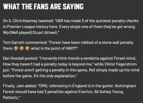 Viktor Fagerstrom:诺丁汉森林一个点球都没有获得,只能说裁判在赛前就已经下定决心不吹点了,这是唯一的可能性。