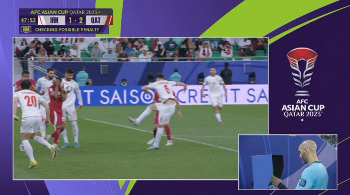 02月08日讯 亚洲杯卡塔尔vs伊朗埃扎托拉希打门,法特希手球,裁判看VAR后判定点球。贾汉巴赫什点射破门,此时比分变为卡塔尔2-2伊朗。