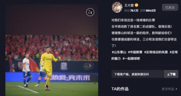 赛后,王大雷在社媒发文:“对我们来说这是一场艰难的比赛,全华班战胜了排名第二的成都队,值得庆祝!”