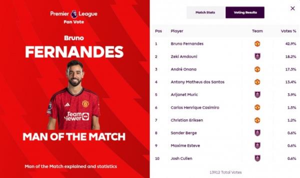 本次票选共有13912次有效投票,其中B费获得了42.9%的投票成功当选全场最佳,排名第二的阿姆杜尼得票率为18.2%,第三的奥纳纳得票率17.3%。