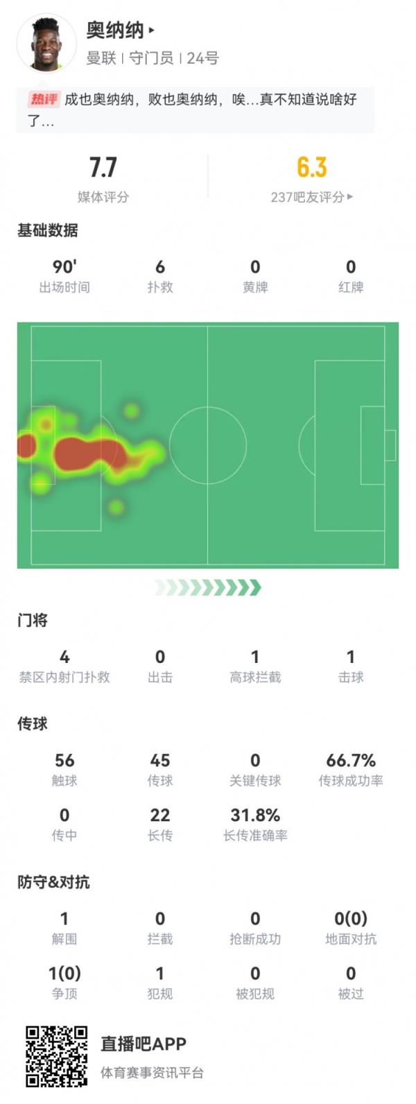 数据方面,奥纳纳本场被射门16次,被射正7次,贡献6次扑救。1次犯规送点。评分7.7分。