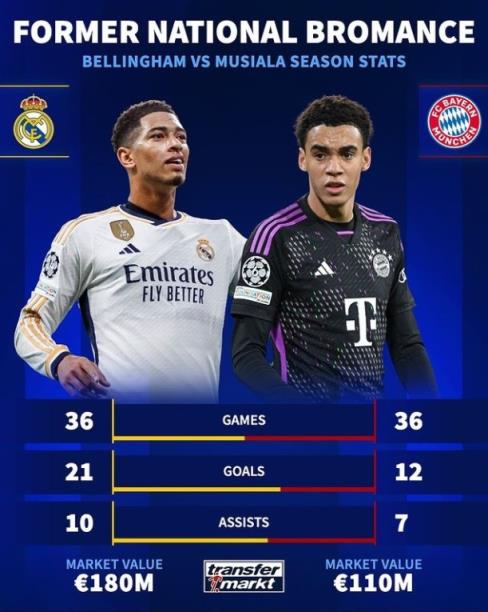 5月1日讯 欧冠半决赛首回合拜仁对皇马的比赛即将打响,德国转会市场网对比了贝林厄姆和穆西亚拉的数据。