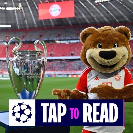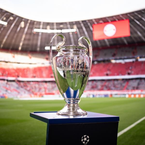 欧洲德比大战在即,赛前拜仁官推晒照,大耳朵杯摆放在安联球场。