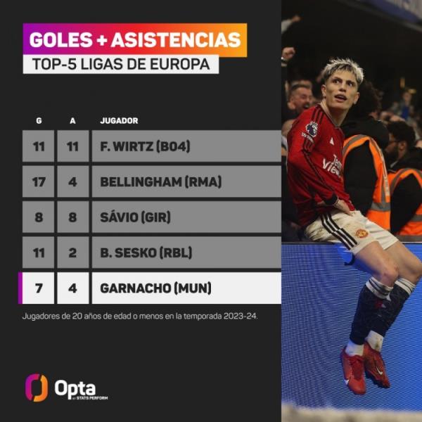 5月1日讯 本赛季截至目前,19岁的加纳乔共在联赛中打进7球、助攻4次。据Opta统计,他是英超本赛季直接参与进球最多的U21球员。