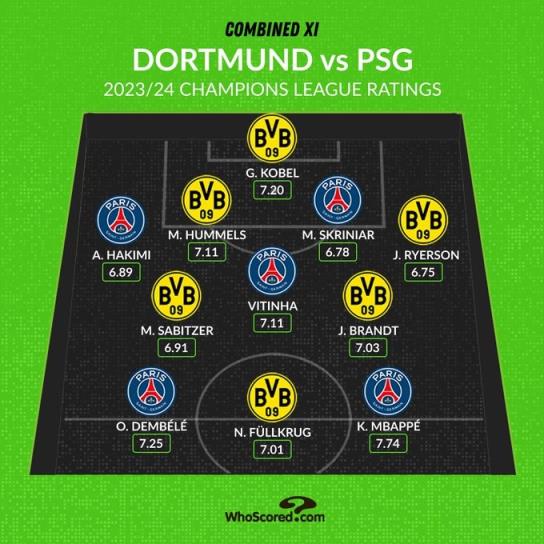 5月2日讯 欧冠半决赛首回合,多特主场对阵巴黎的比赛即将打响。赛前,知名足球数据机构WhoScored列出了两队合体的最佳阵容,其中,姆巴佩领衔,科贝尔守门,登贝莱、维蒂尼亚等球员悉数入选。