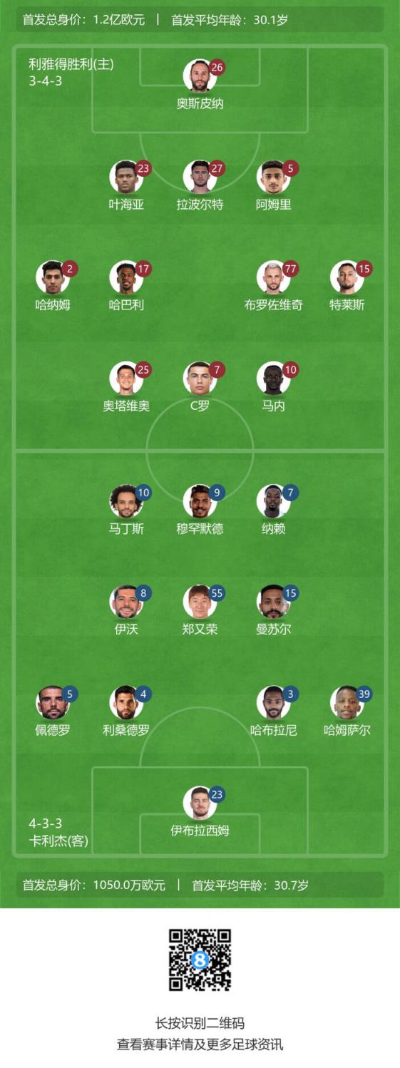 利雅得胜利首发:26-奥斯皮纳、2-哈纳姆、5-阿姆里、27-拉波尔特、15-特莱斯、17-哈巴利、77-布罗佐维奇、25-奥塔维奥、23-叶海亚、10-马内、7-C罗