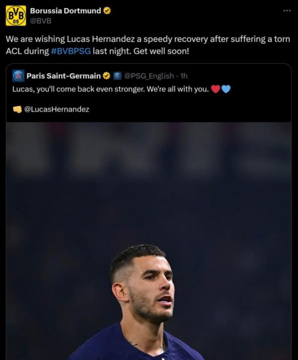 多特官推转发了巴黎为卢卡斯加油的动态,并写道:“在昨晚的比赛中,卢卡斯十字韧带断裂,我们希望他能早日康复。希望你能快点好起来!”