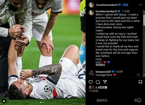 卢卡斯写道:“当我和巴黎签约时,我承诺我会全身心投入于这支球队,从那时起我就一直在这样做。遗憾的是,在昨晚的比赛中,我受伤了。当时,我努力让自己重新回到球场上,尝试继续为我们的球队而战,但我做不到。”