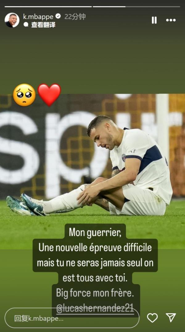 5月2日讯 在对阵多特的欧冠半决赛中,卢卡斯受伤下场,巴黎官方确认球员左膝前十字韧带断裂。随后,姆巴佩更新了社交媒体,为卢卡斯加油打气。