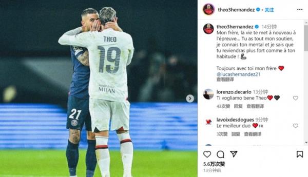 在个人社媒,特奥晒出和卢卡斯的合照,他同时配文:“生活再次考验了你,我全力支持你,我相信你的精神力量,你归来时会比以往更强大,永远和你在一起。”
