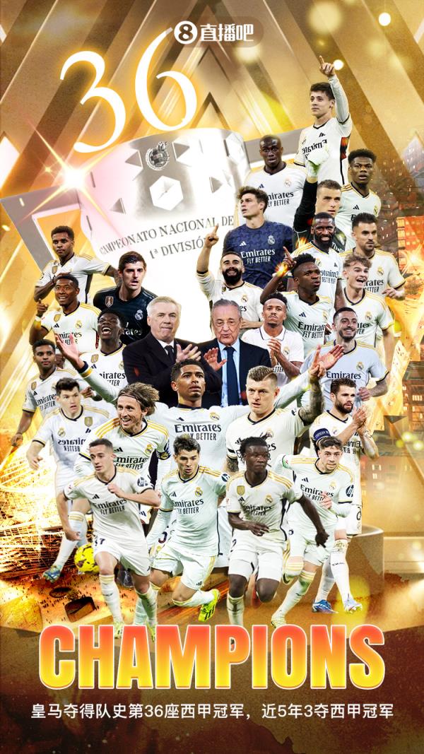 这是皇马第36座联赛冠军,在这一奖杯数量上,银河战舰已经比巴萨多出了9座!