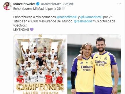 马塞洛写道:“恭喜我的皇马夺得联赛第36冠。恭喜我的兄弟莫德里奇和纳乔在世界上最大的俱乐部中获得25个冠军,@皇马为你感到非常骄傲!”