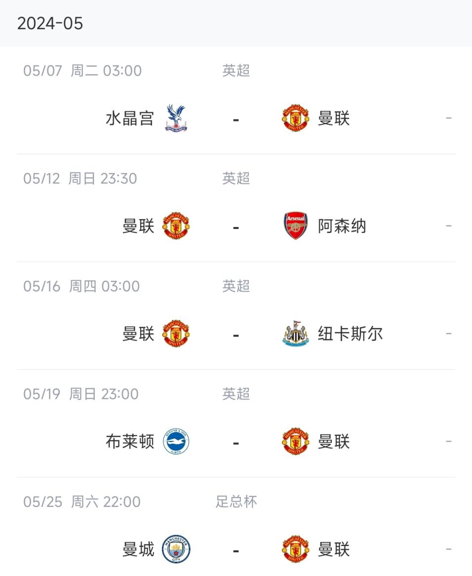 曼联未来还剩4场英超比赛和一场足总杯决赛,最后三轮英超他们将对阵水晶宫、阿森纳、纽卡和布莱顿。足总杯决赛将战曼城。