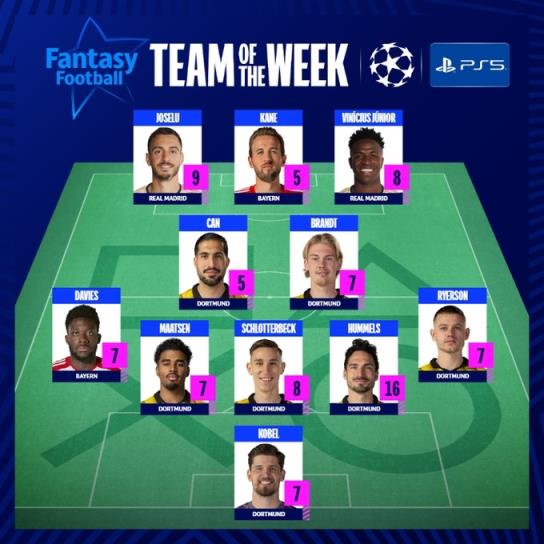 5月10日讯 欧冠官方公布本周最佳阵容,多特7人入围,何塞卢、凯恩、维尼修斯、阿方索-戴维斯在列。