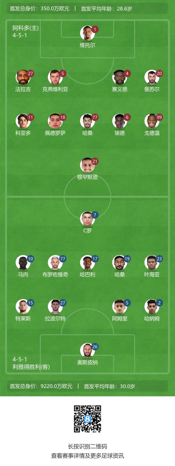 利雅得胜利首发:26-奥斯皮纳、2-哈纳姆、5-阿姆里、27-拉波尔特、15-特莱斯、17-哈巴利、19-哈桑、77-布罗佐维奇、23-叶海亚、10-马内、7-C罗