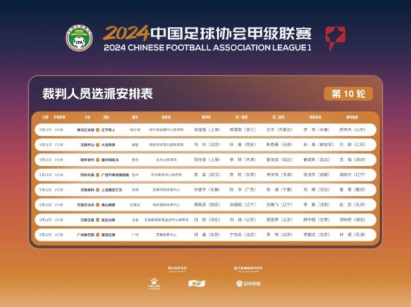 5月11日讯 中甲官方公布第10轮裁判安排,刘钊吹罚江西庐山对阵大连英博,何鑫吹罚广州队对阵青岛红狮。