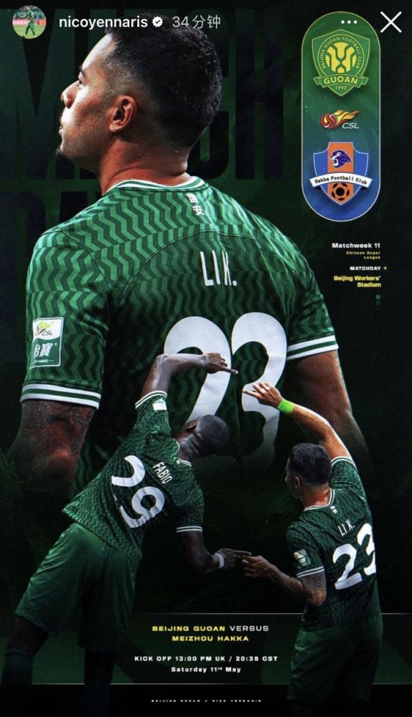 5月11日讯 李可在个人社媒晒出了今晚国安主场对阵梅州客家的个人比赛海报。