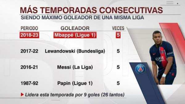 5月11日讯 姆巴佩宣布不会与巴黎续约,目前他以26球排名法甲射手榜首位,领先第二名戴维9球,ESPN指出,姆巴佩有望在离开法甲之前连续6年获得联赛金靴,从而成为五大联赛首位做到这一点的球员。