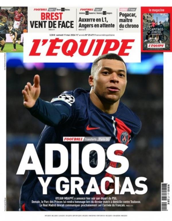 法国媒体《队报》今日以姆巴佩为封面人物,标题为:“再见,感谢。”