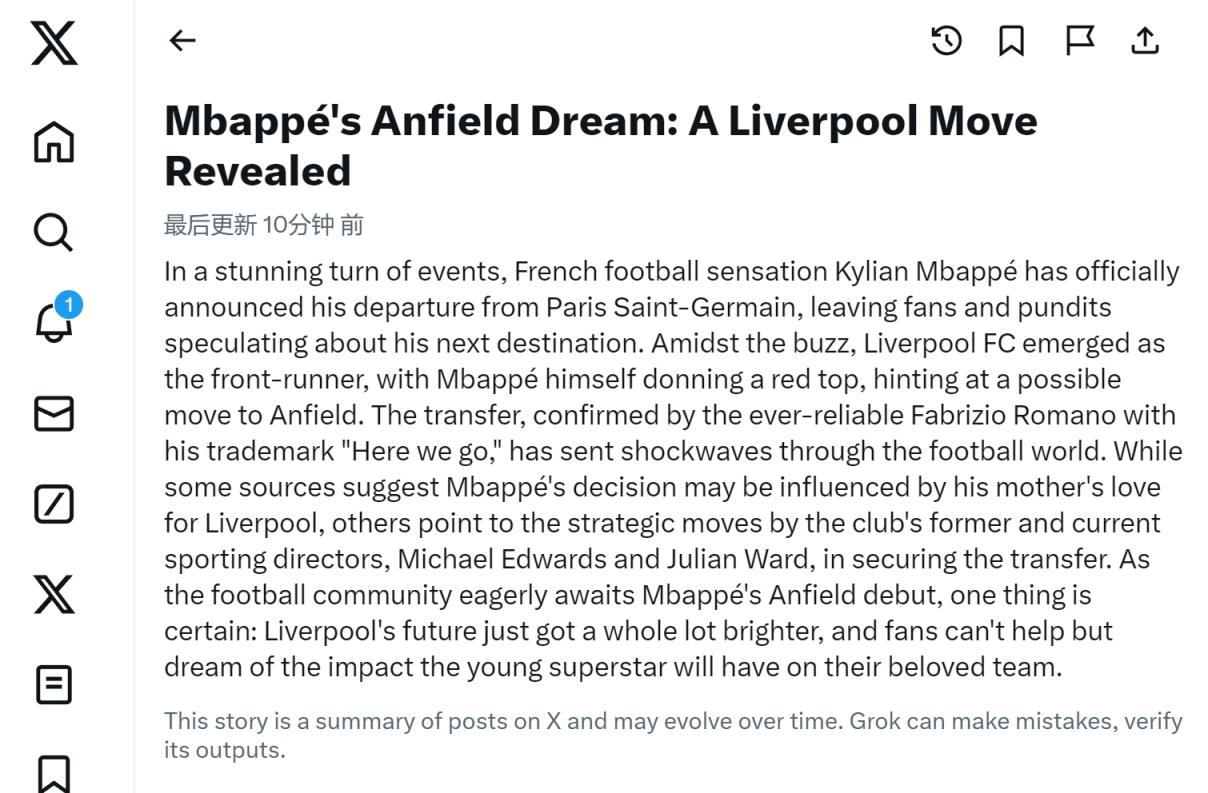 5月11日讯 姆巴佩自宣赛季末离开巴黎,短时间内在社交媒体上引发热烈讨论。短时间内产生了30多万条帖子,社交媒体推特自带的大数据AI“Grok”对消息进行了摘要,不过似乎……