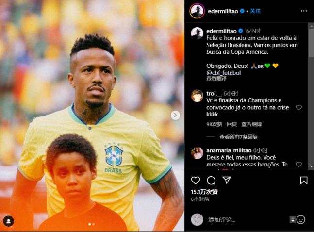 米利唐在个人社媒写道:我很高兴也很荣幸能重返巴西国家队。让我们一起向美洲杯发起冲击。感谢上帝