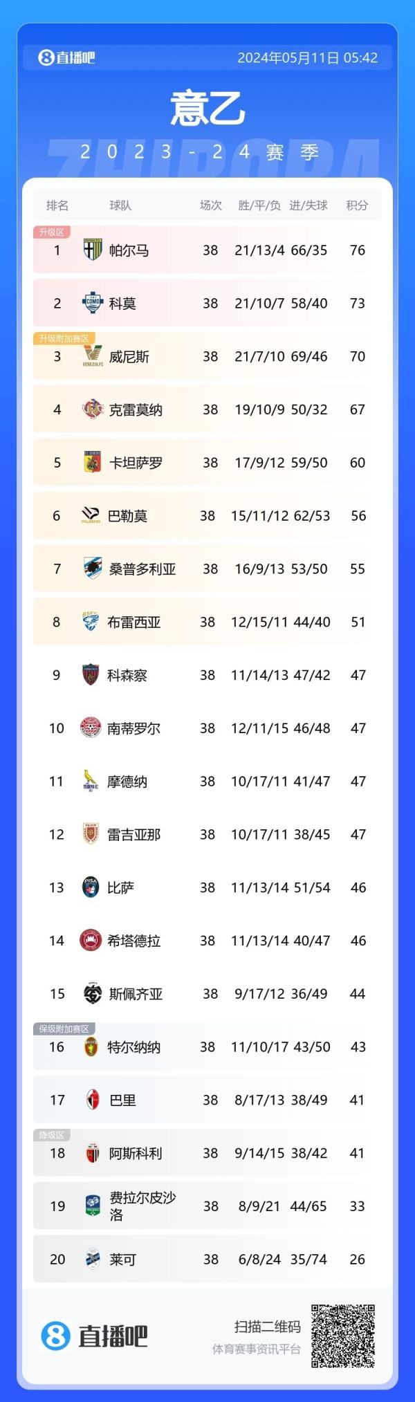 5月11日讯 本赛季意乙收官,帕尔马、科莫获得前两名升级,第三至第八六支球队将进行升级附加赛,争夺最后一个升级名额。