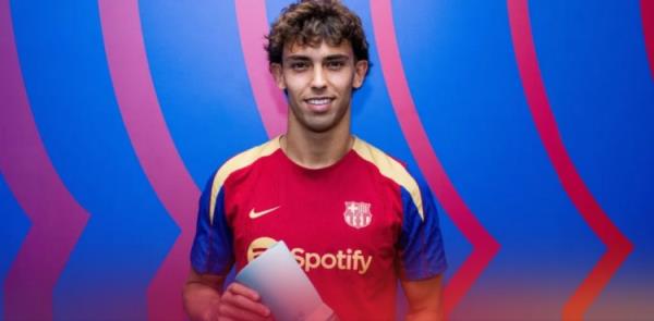 当地时间上午结束训练后,菲利克斯在巴萨体育城领取了西甲月度最佳进球的奖杯。