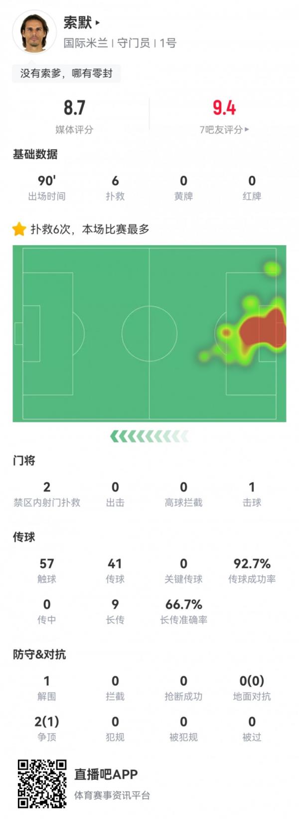 5月11日讯 本轮意甲,国米5-0客胜弗洛西诺内。此役索默发挥出色全场高接低挡力保球门不失,球员全场重点数据如下↓