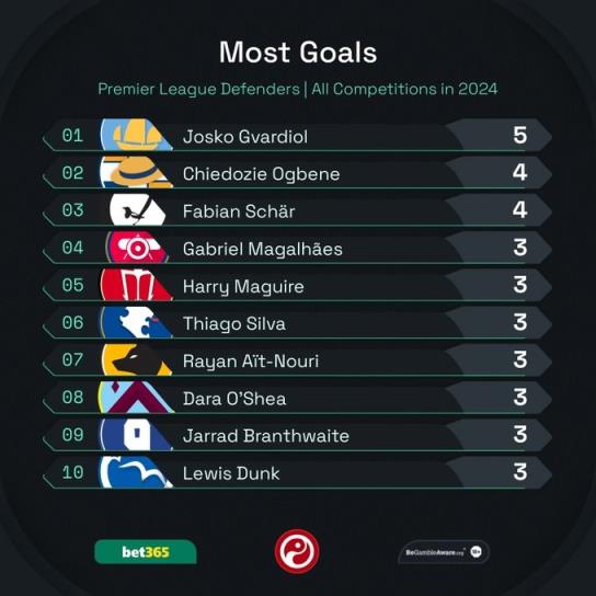 5月12日讯 英超第37轮,曼城4-0大胜富勒姆,蓝月后卫格瓦迪奥尔本场完成了双响。数据网站Squawka统计了2024年所有比赛中,英超后卫的进球榜,格瓦迪奥尔5球排名第一。