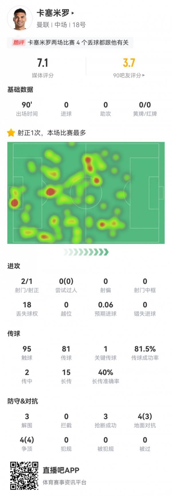 5月13日讯 英超第37轮焦点战,曼联主场0-1不敌阿森纳。此役卡塞米罗首发打满全场出现致命失误,球员全场重点数据如下↓