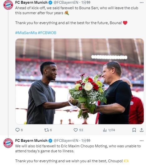 拜仁官方:本赛季结束后,舒波-莫廷与萨尔将离开拜仁慕尼黑。赛前,安联球场也为两位球员举行了告别仪式,其中舒波-莫廷因生病原因未能出席。