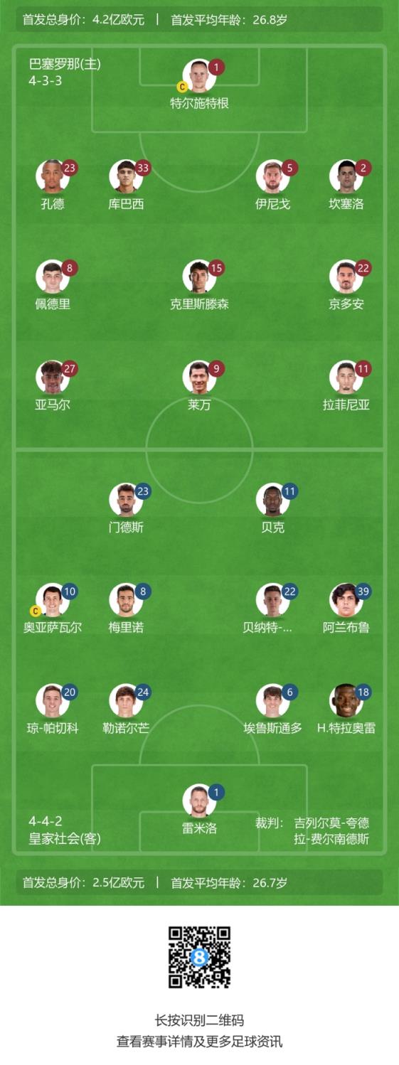 巴萨首发:1-特尔施特根、2-坎塞洛、5-伊尼戈-马丁内斯、15-克里斯滕森、23-孔德、33-库巴西、8-佩德里、22-京多安、11-拉菲尼亚、27-亚马尔、9-莱万