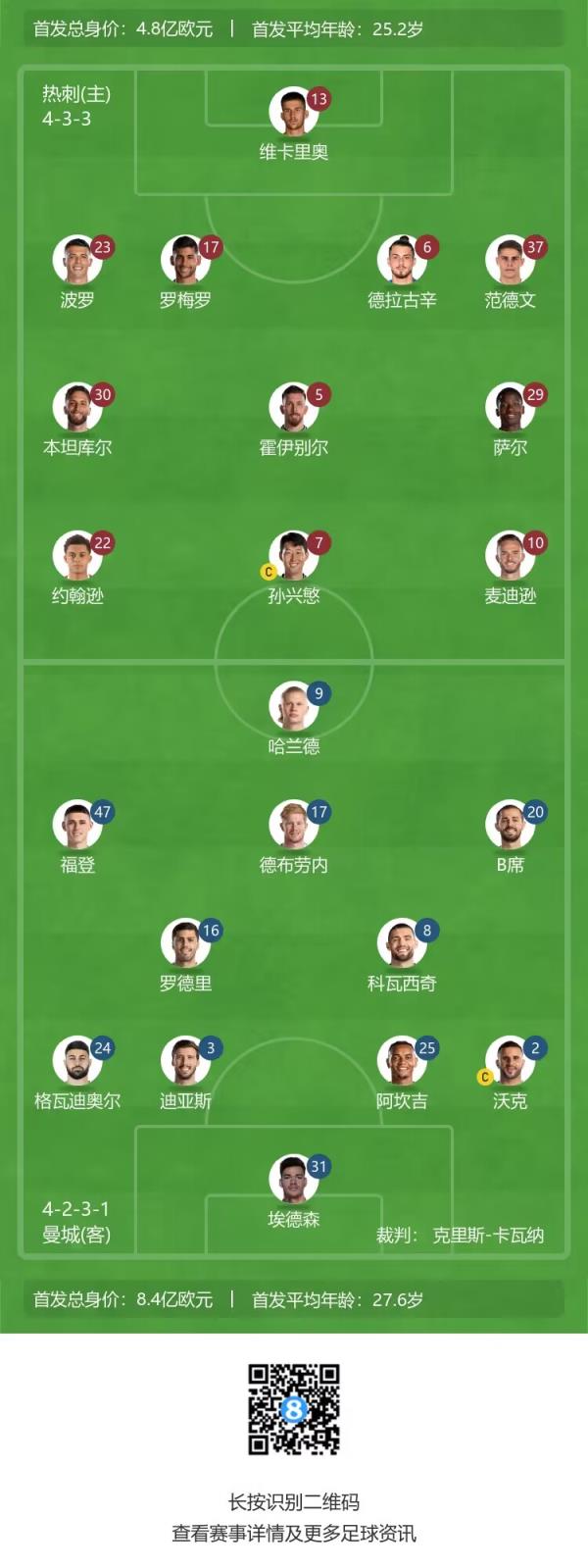 热刺首发:13-维卡里奥、23-波罗、17-罗梅罗、6-德拉古辛、37-范德文、5-霍伊别尔、30-本坦库尔、29-萨尔、22-布伦南-约翰逊、10-麦迪逊、7-孙兴慜