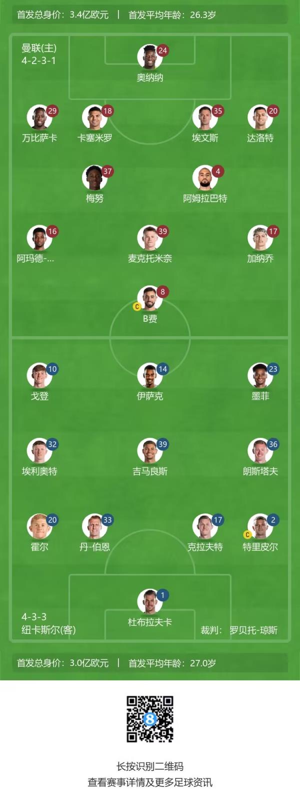 曼联首发:24-奥纳纳、20-达洛特、29-万比萨卡、35-埃文斯、18-卡塞米罗、4-阿姆拉巴特、37-梅努、39-麦克托米奈、16-迪亚洛、17-加纳乔、8-B费