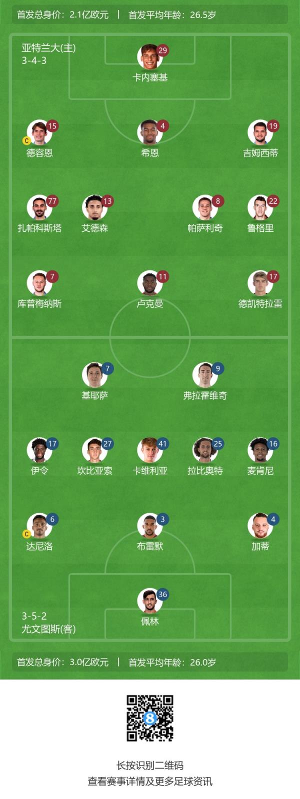 亚特兰大首发:29-卡内塞基、19-吉姆西蒂、4-希恩、15-德容恩、22-鲁杰里、13-埃德森、8-帕萨利奇、77-扎帕科斯塔、7-库普梅纳斯、11-卢克曼、17-德凯特拉雷