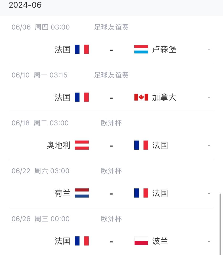 本届欧洲杯,法国与波兰、荷兰和奥地利同分在D组,首场小组赛将对阵奥地利。欧洲杯前,法国还将与卢森堡和加拿大进行热身赛。