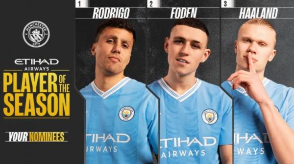 5月17日讯 曼城官方公布赛季最佳球员候选,三位候选人分别是罗德里、福登以及哈兰德。