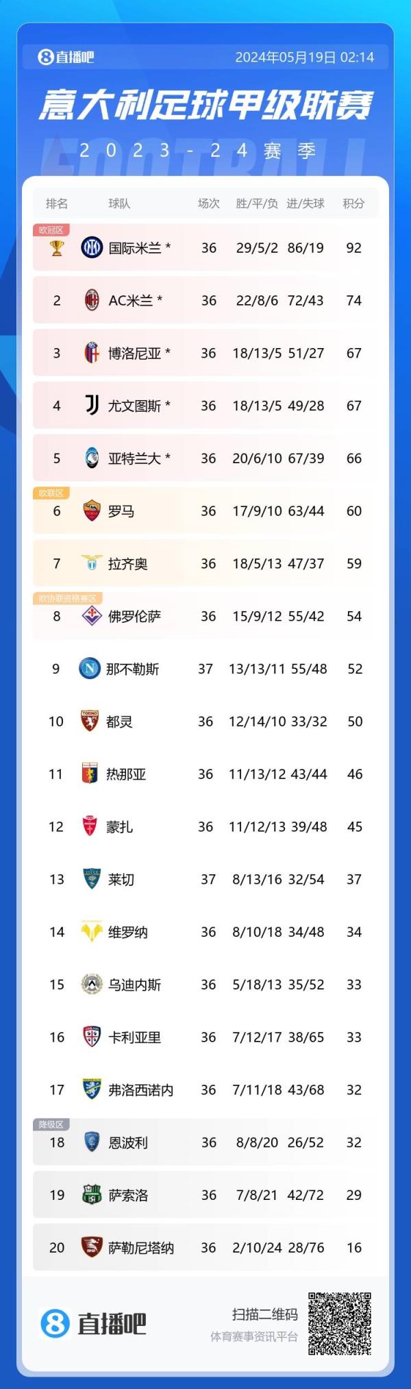 目前,意甲共有5支球队获得下赛季欧冠资格:国米、AC米兰、博洛尼亚、尤文、亚特兰大。