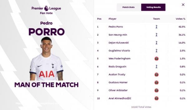 本次票选共有16160次有效投票,其中波罗获得了42.5%的投票当选全场最佳。排名二三位的孙兴慜、库卢得票率分别为36.1%和16.0%。
