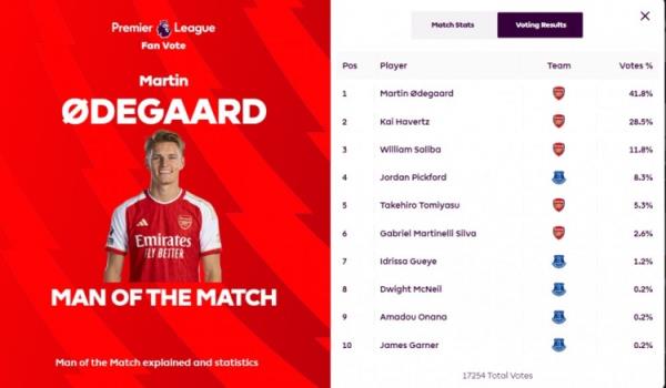 本次票选共有17254次有效投票,其中厄德高获得了41.8%的投票当选全场最佳。排名二三位的哈弗茨、萨利巴得票率分别为28.5%和11.8%。